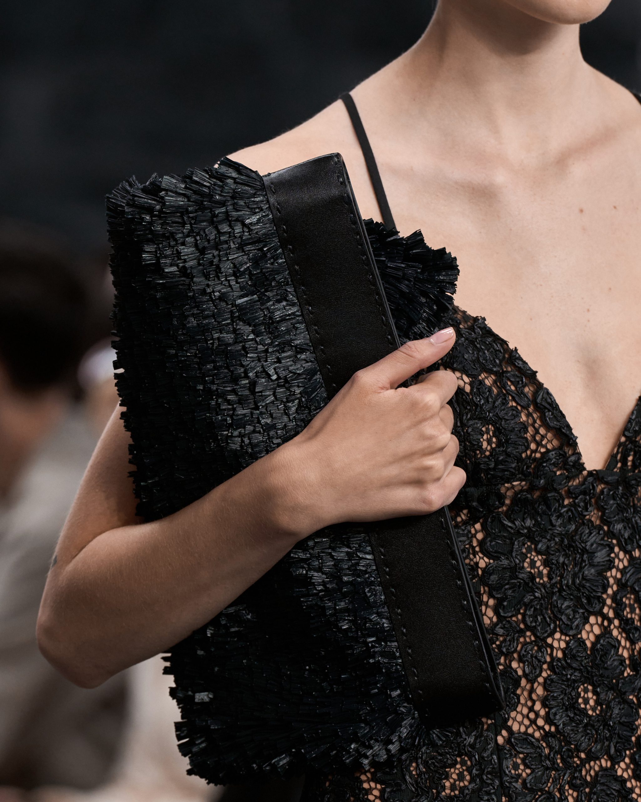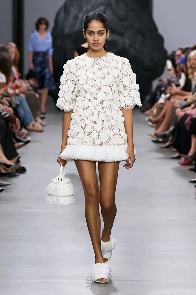 Texture is the essence of this season, inspired by vintage cinema and classic photography. The collection features relaxed raffia embroidery, floral designs, luxurious lace, and sleek satin and cotton fabrics, embodying a lived-in elegance.