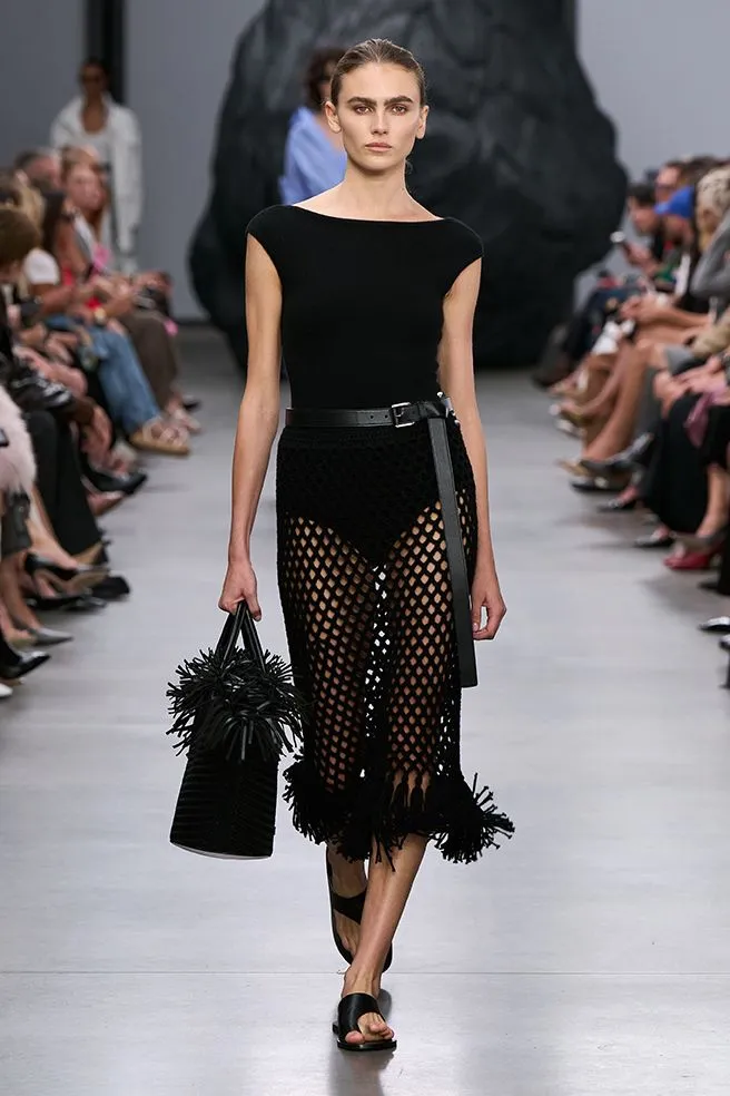 Expect shapely silhouettes, defined waists, long-line sheaths, soft skirts, and loose trousers, enhanced by dramatic necklines and minimalist tailoring. The color palette includes textural black and white paired with earthy tones like chocolate, ecru, and vibrant blues and greens.